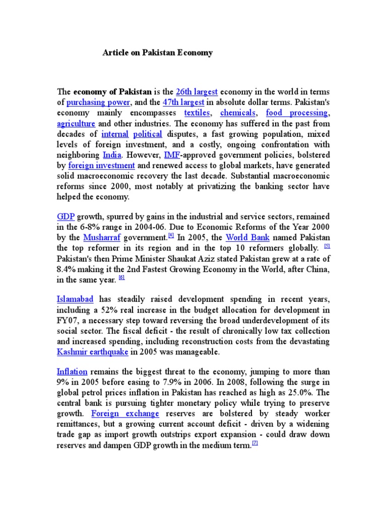 The present regime has miserably failed to improve any of the sectors responsible for the economic hardships of the nation. At the moment our economic system is standing at the verge of collapse. In the coming pages, essay on pakistan economy, we will try to explore the causes of economic problems; their effects on the socio- political landscape of the country and finally discuss same suggestions to salvage the economic recovery. The growth rate of about 3, essay on pakistan economy. The government in its budget scheme projected the growth rate at 4. The International Monetary Fund IMF estimated growth rate is lowest in South Asia, even behind Bangladesh and Sri Lanka.