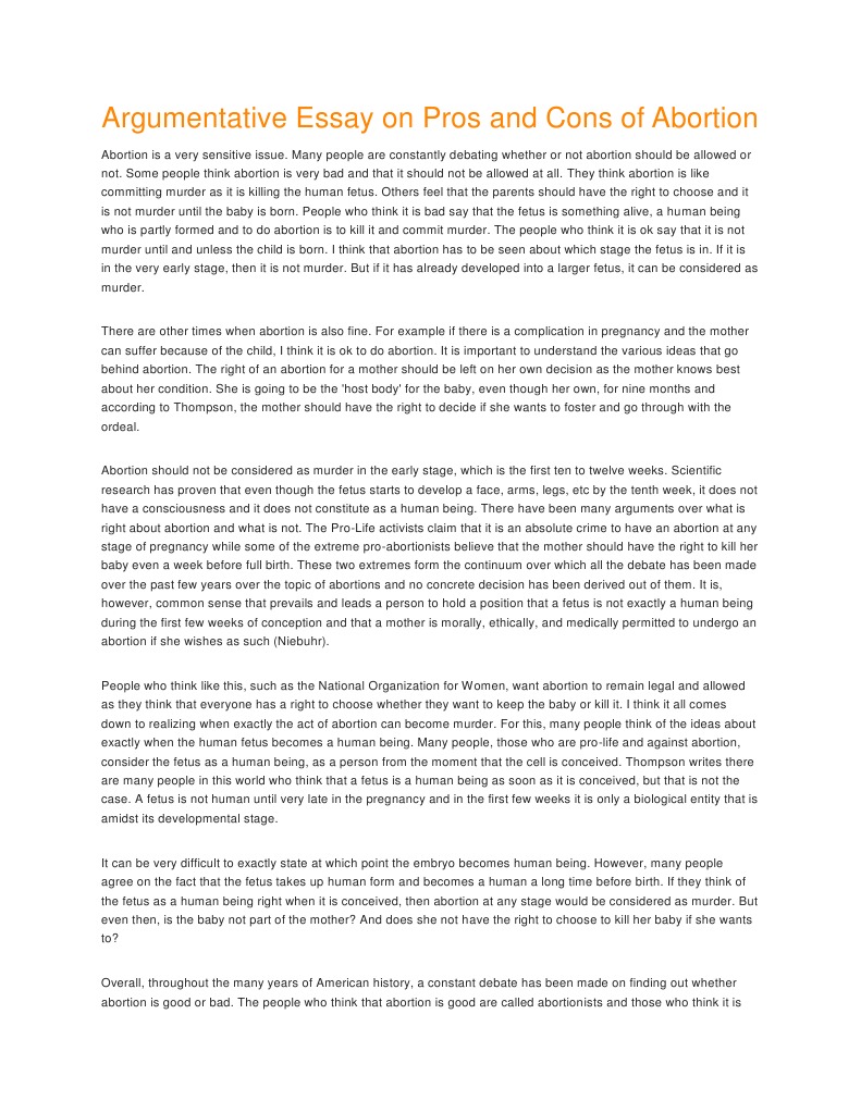 Abortion might be a better option than a life full of suffering and pain for the mother and her baby. Abortion: Pros and Cons. This paper was written and submitted to our database by a student to assist your with your own studies. You are free to use it to write your own assignment, however you must reference it properly. If you are the original essays on abortion pros and cons of this paper and no longer wish essays on abortion pros and cons have it published on StudyCorgi, request the removal. Learn More. Abortion and Moral Theory. Virtual Reality Cases Usage in Nursing, essays on abortion pros and cons. Cite this paper Select style. Select citation styles APA-6 APA-7 MLA-8 Chicago N-B Chicago A-D Harvard.
